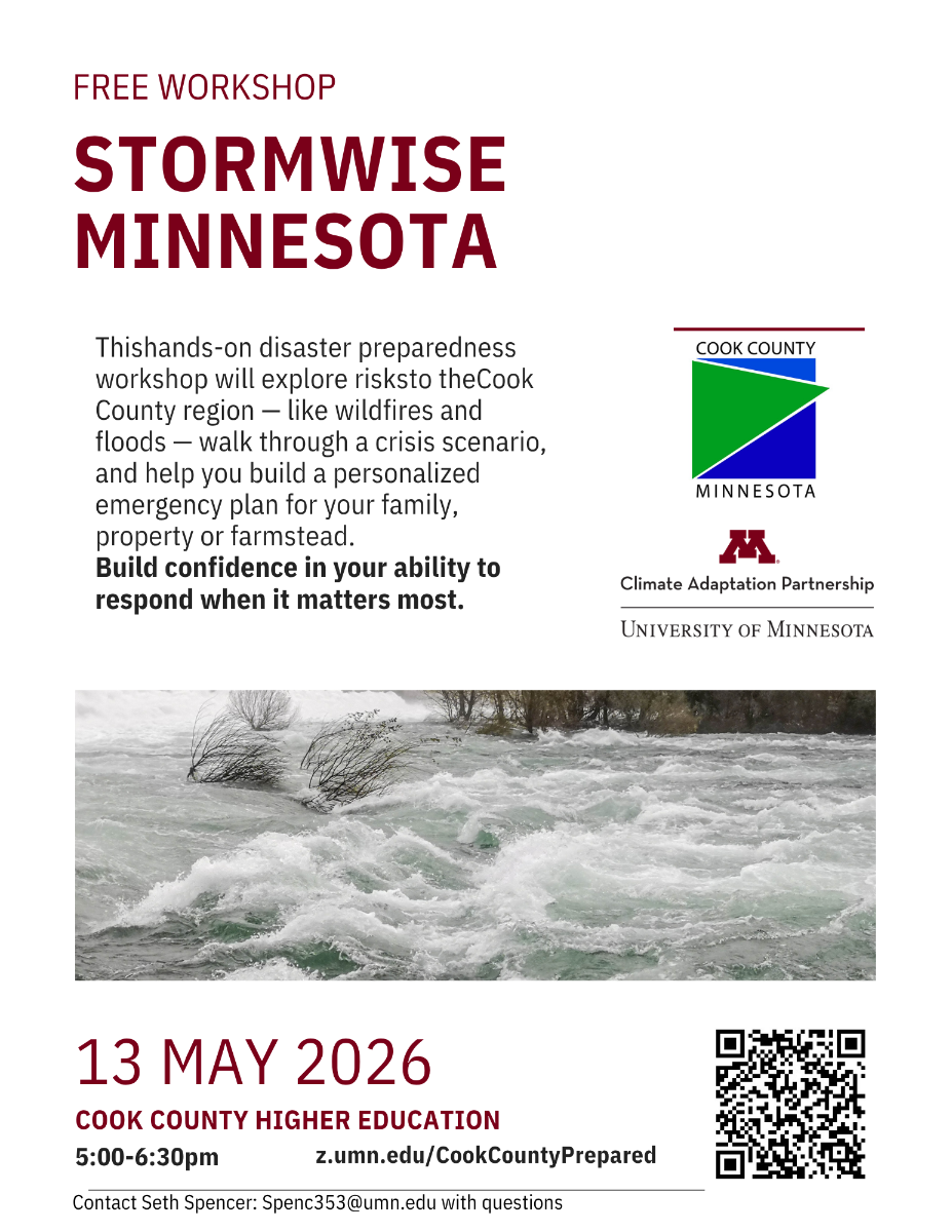 Prepare for unexpected events with this hands-on emergency preparation workshop from University of Minnesota Extension's Climate Adaptation Partnership. In this event, participants will explore risks to the Cook County region such as wildfires and floods, walk through a realistic scenario, and build a personalized emergency plan for their family and property. Attendees will leave with practical tools for creating a preparedness kit and greater confidence in their ability to respond when it matters most.